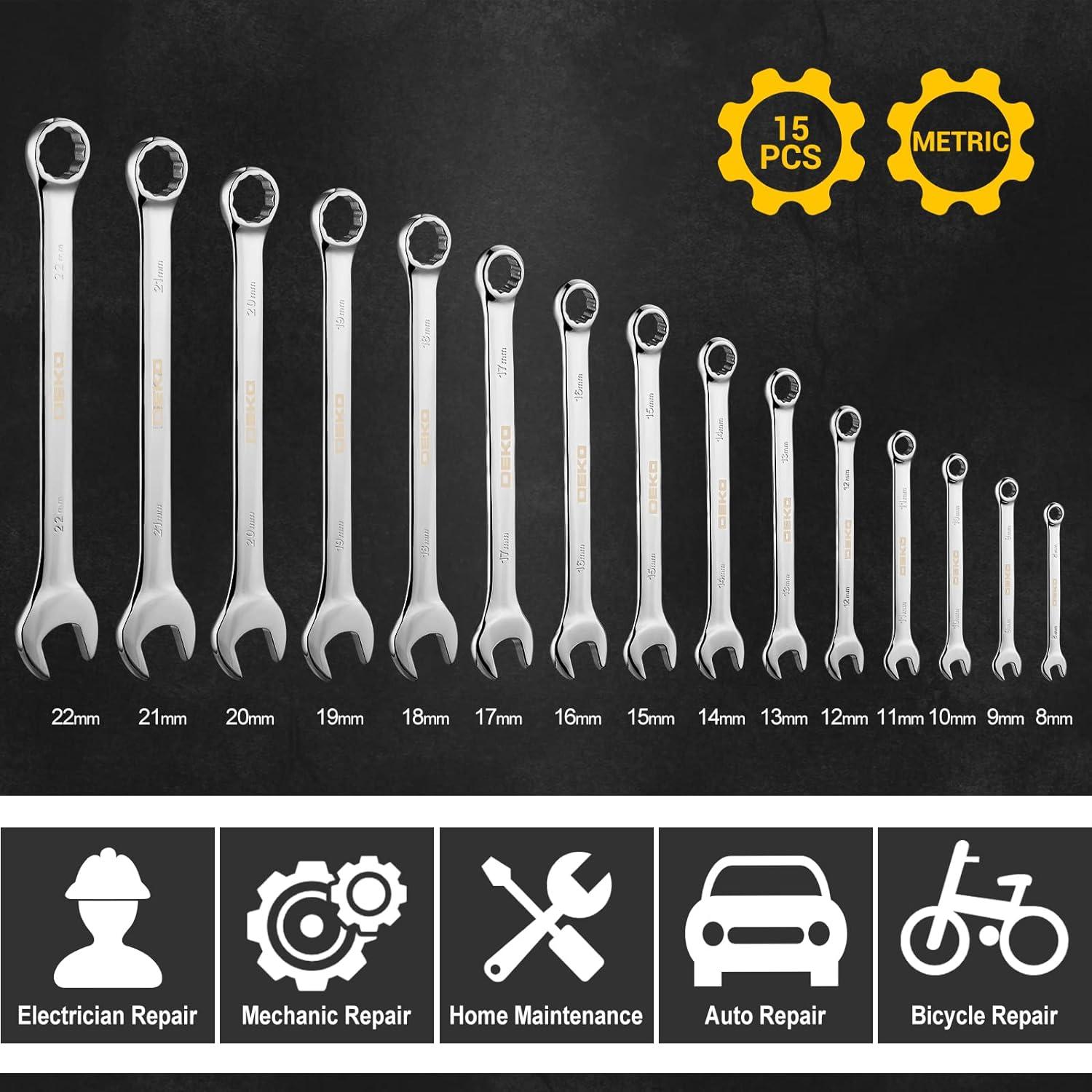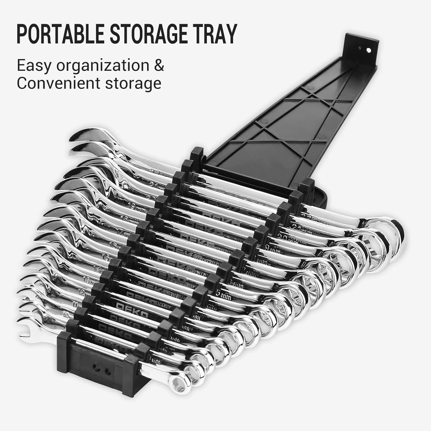DEKOPRO Combination Wrench Set, SAE&Metric, 30-piece, 1/4” to 1” & 8-22mm, 12-Point, Chrome Vanadium Steel, with Plastic Tray(15-Piece (8-22 mm))