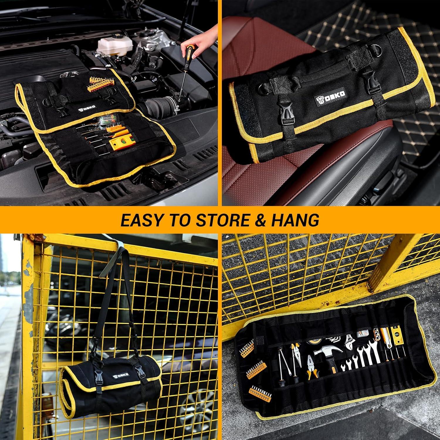 【EASY TO STORE & HANG】Easy to hang your portable travel roll up tool bag organizer in your car, garage or workshop.No more lugging your toolbox around, just tear off the section of multi tools you need. 28 pockets and straps keep your tools secure and handy when you need them.