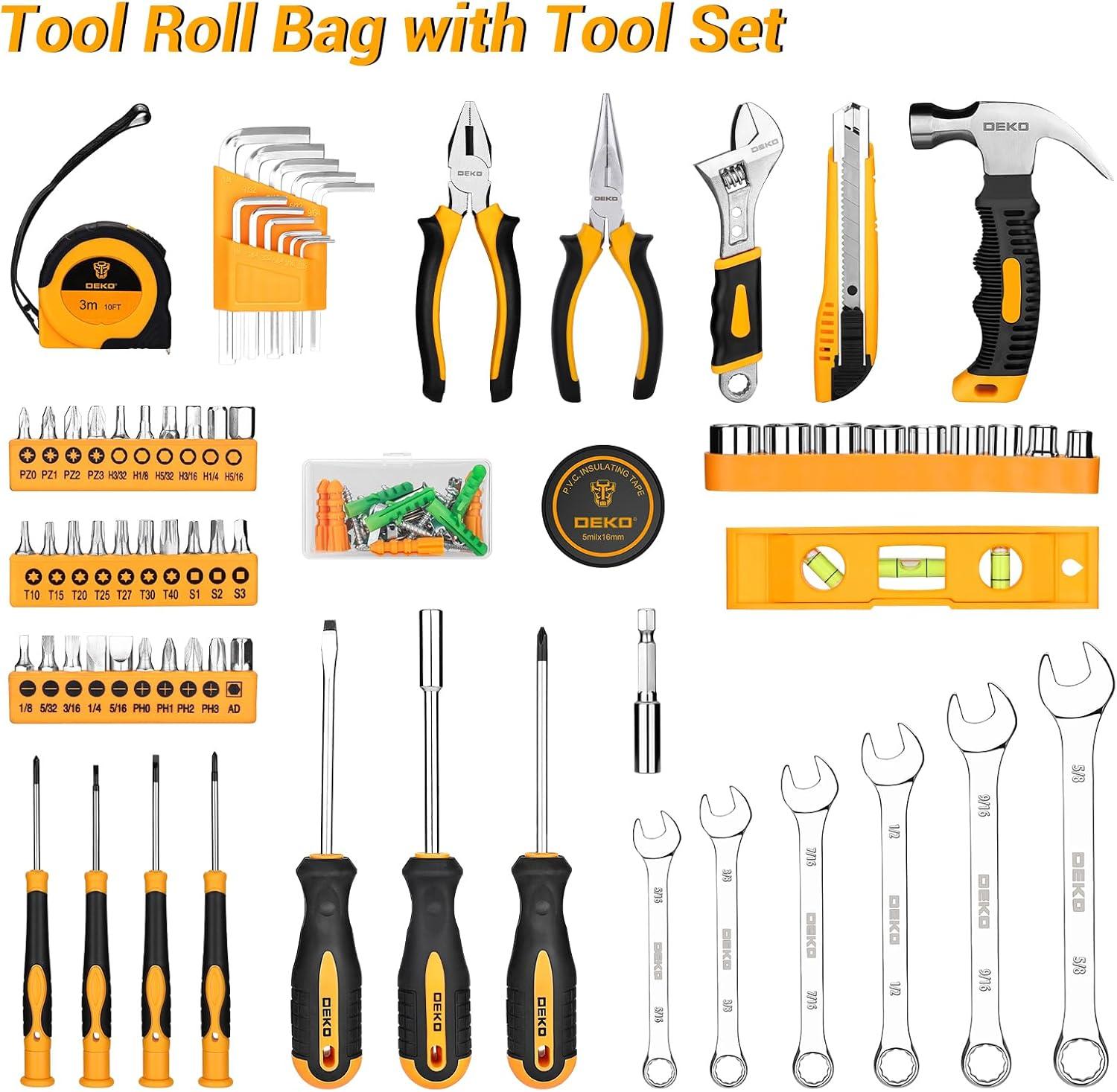 【ALL TOOLS IN ONE BAG】A roll-up toolbag: Screwdrivers, Bit Holder, Bits, Precision Screwdrivers, Combination Pliers, Long Nose Pliers, Utility Knife, Measure Tape, Combination Wrenches, Level, Insulating Tape, Claw Hammer, Adjustable Wrench, Hex Key Wrenches, Utility Knife, Fasteners, Magnetic Bits Holder, sockets