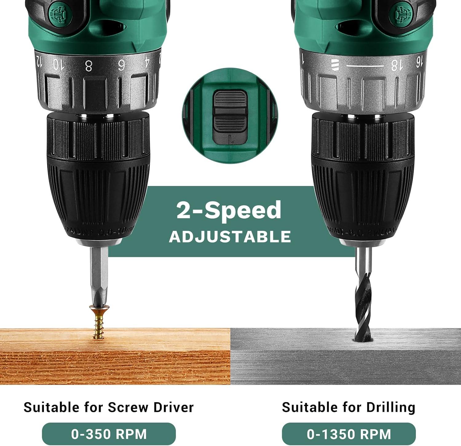 【20 V Electric Drill】This electric drill cordless has two Variable Speed (0-350/0-1350 rpm) and 18+1 torque settings