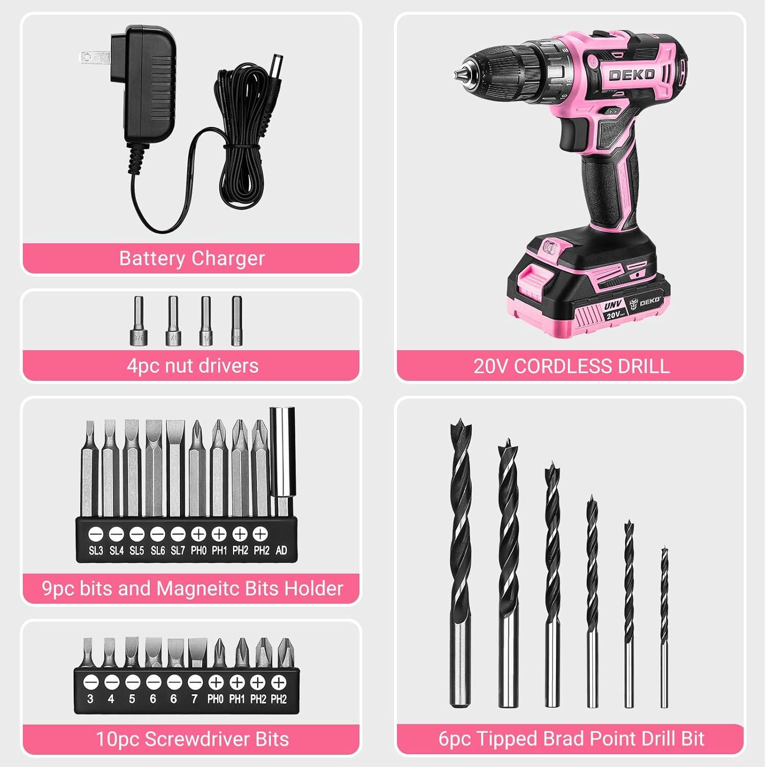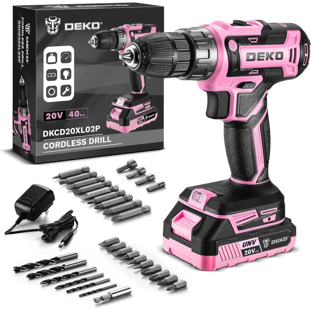 Power Drill Cordless: DEKO PRO Pink Cordless Drill 20V Electric Power Drill Set Tool for Women Drills with Battery and Charger 20 Volt Drills Driver Kit(Pink)