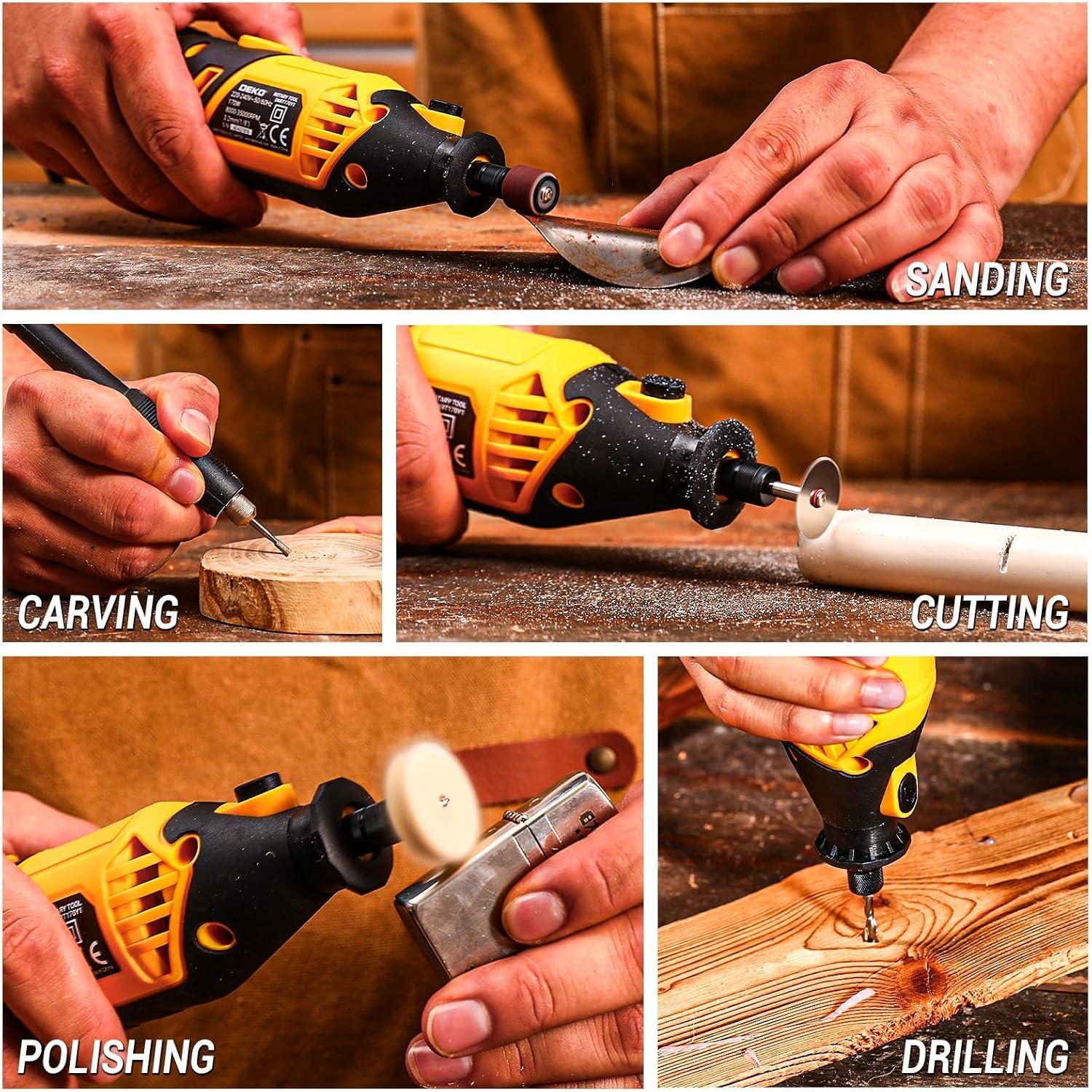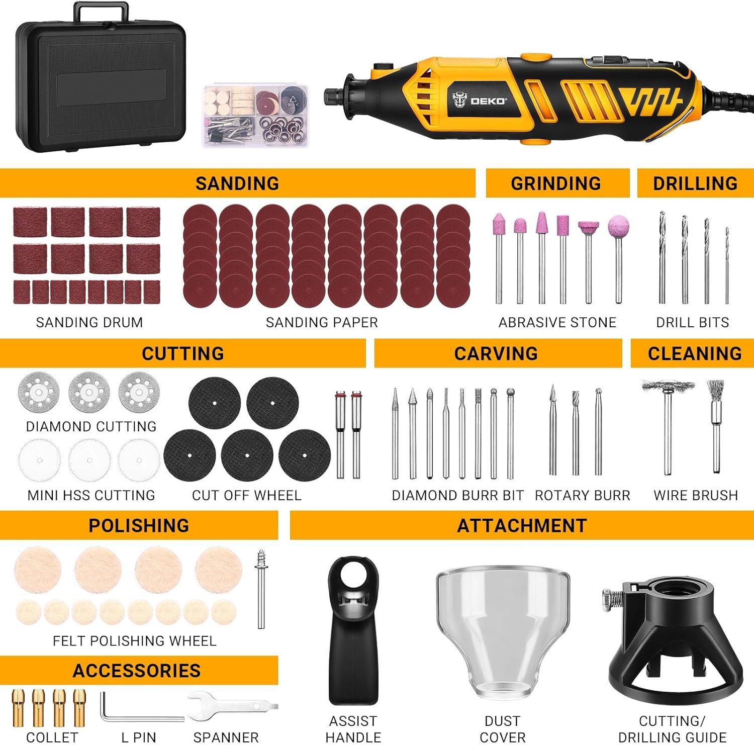 【127pcs Accessories Multi-purpose】: Cover Shield provide better protection for cutting and grinding. Drill Locator helps for precision woodworking. Buffing wheel can repair dents and clean surface dirt for a smoother, cleaner finish.Home rotary tool kit with multitools accessories, as mini sander tool, polisher, die grinder, wood carving/sculpting tools, grout removal tool, metal cutter, engraver etc, and enabling you to achieve different crafting work efficiently.