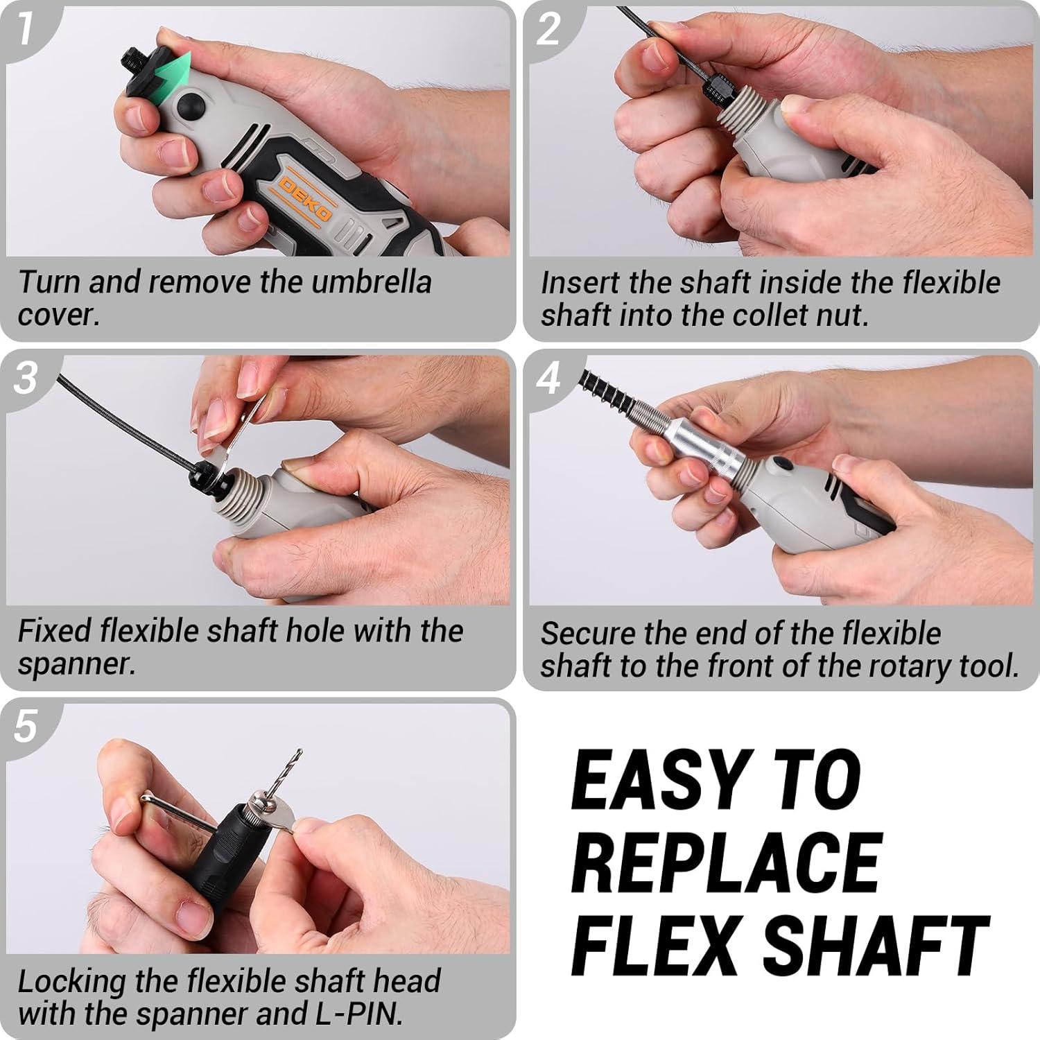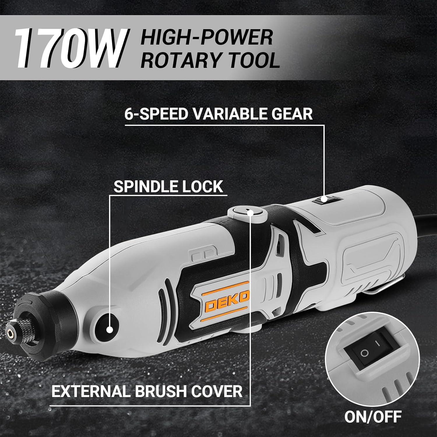 【Speed Adjustment & Flex Shaft】: The gray rotary tool equipped with a powerful 170w motor, 1.8m flexible shaft, 8000~35000RPM, 6-speed adjustment, gear adjustment making it easier and more table to adjust the speed, helping to complete handwork from cutting metal to polishing jewelry. The detailing kit with flexible shaft like a pen reduce vibration and better control for precision, corner polishing.
