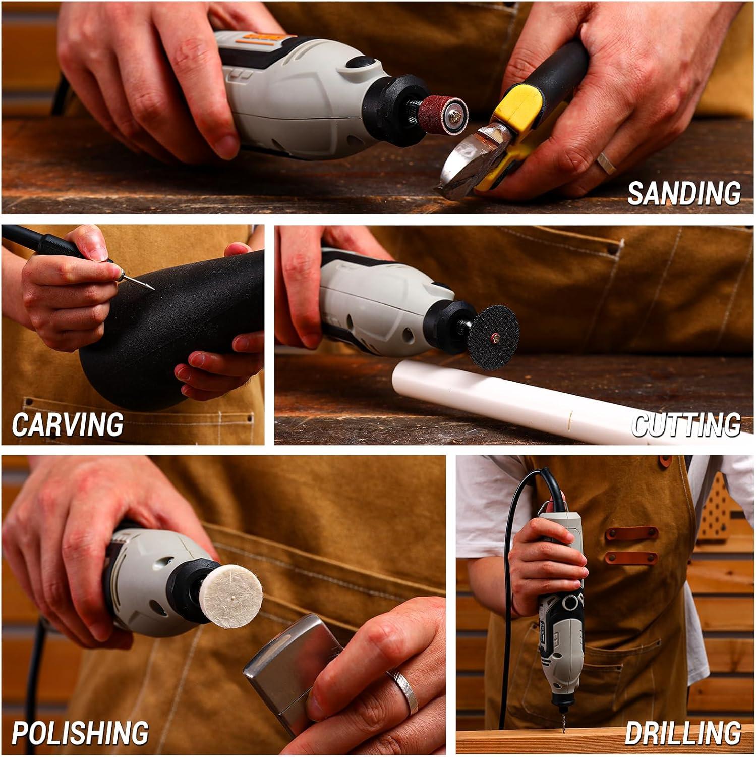 【127pcs Accessories Multi-purpose】: Cover Shield provide better protection for cutting and grinding. Drill Locator helps for precision woodworking. Buffing wheel can repair dents and clean surface dirt for a smoother, cleaner finish.Home rotary tool kit with multitools accessories, as mini sander tool, polisher, die grinder, wood carving/sculpting tools, grout removal tool, metal cutter, engraver etc, and enabling you to achieve different crafting work efficiently.