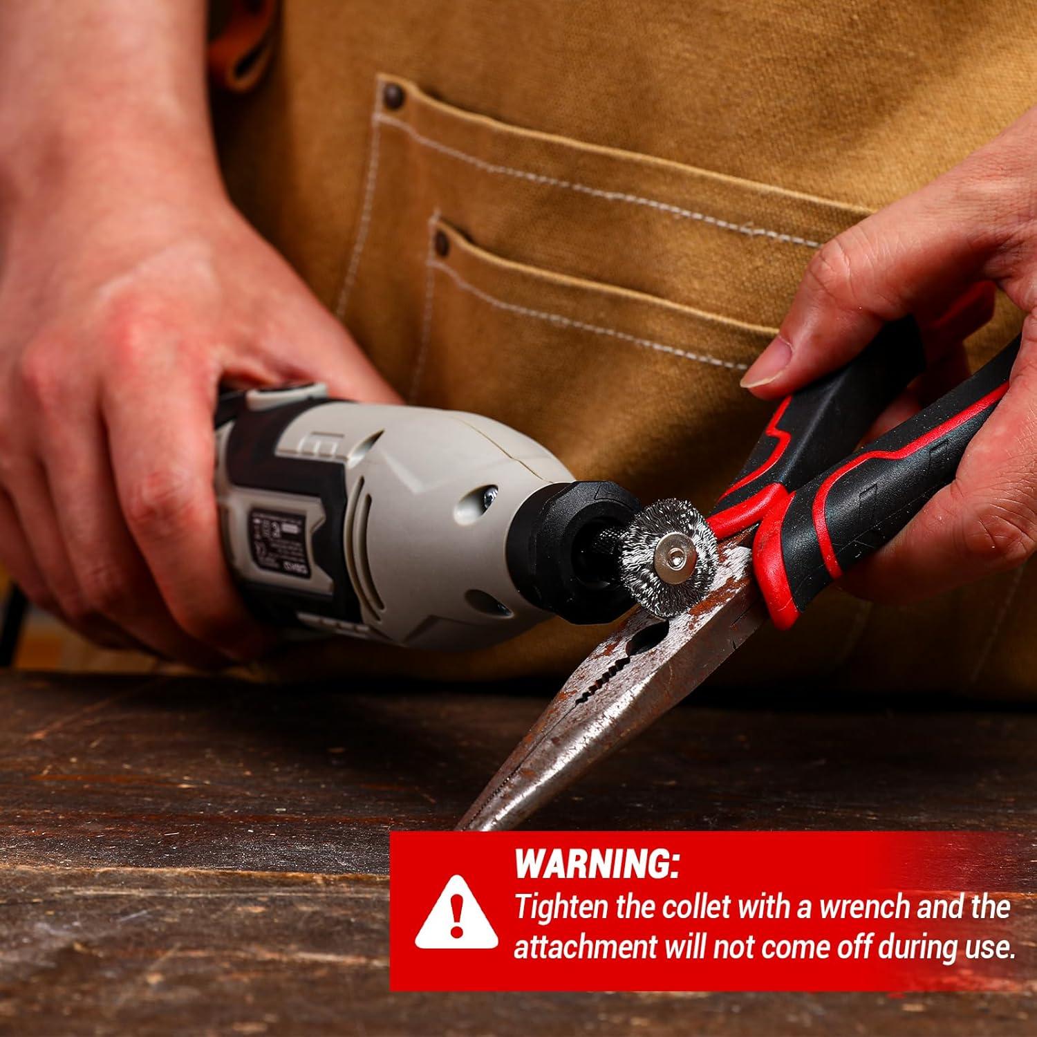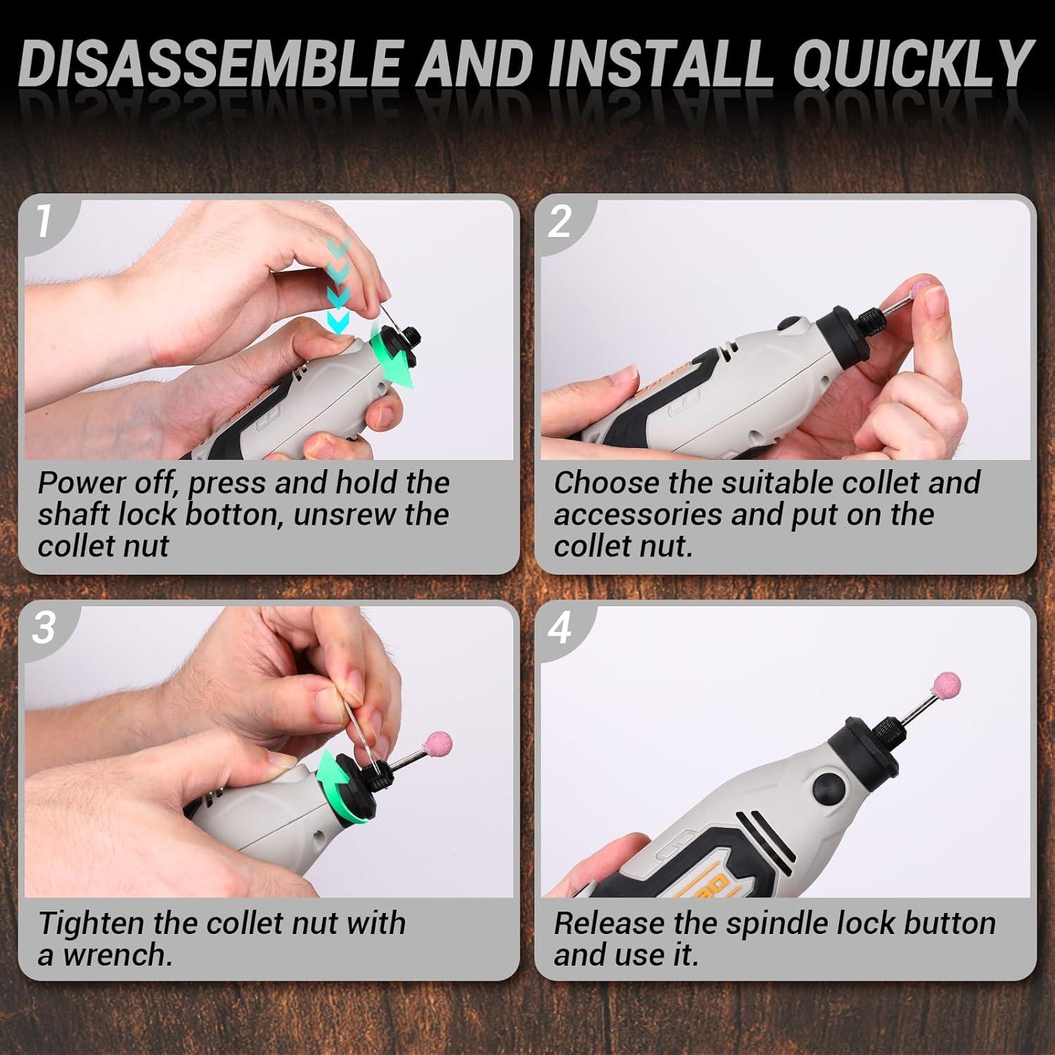 【More Compatibility】: This power rotary tool is equipped with 4 collets: 1/8″, 2x 1/16″((1 has been mounted on the tool), 3/32″, offers wider compatibility and more stable when setting accessories for grinding, cutting, wood carving, sanding, engraving, and other working tools. The 3-jaw universal chuck stabilizes your project and allows to quickly and easy change accessories on rotary machine.